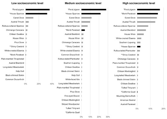Relative abundance of bird species recorded in residential areas of low, medium, and high socioeconomic levels. Asterisks show nonnative species (*, black bar) and species of uncertain origin (**).