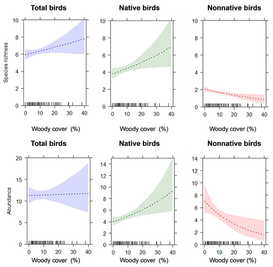 Unlike native birds, we found that the species richness and abundance of nonnative birds decreased with increasing woody vegetation cover. This result is consistent with previous findings at the species level, where the abundance of nonnative species P. domesticus and C. livia decrease with increasing woody vegetation [31]. Built-up areas commonly offer appropriate habitats for these species, providing anthropogenic food and nesting sites, allowing these birds to reach high abundance [31,52,62]. In addition, woody vegetation promotes greater abundance and richness of native birds [21,56] that may interact with nonnative birds through competition [63,64], limiting the abundance of nonnative birds.