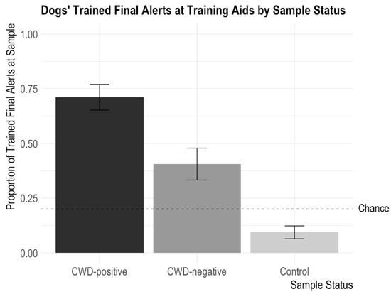Dogs’ proportions of trained final responses to training aids according to CWD status (CWD-positive, CWD-negative, and controls). The error bars show standard error. Dogs issued alerts significantly more often for CWD-positive aids than CWD-negative aids and significantly more often for both CWD-positive and CWD-negative aids than control samples. The highest possible chance level was 0.20; chance could be lower than 0.2 based on the number of “blank” trials in the session.