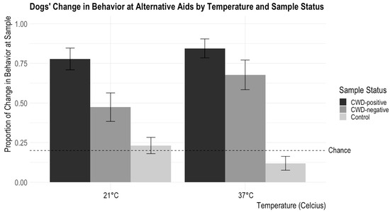 Dogs’ proportions of changes in behavior at a sample according to incubation temperature and sample status are shown. The error bars show standard error. Chance was set at about 20% (it could be slightly lower depending on the number of blank trials—trials without a target odor—in a session). Dogs showed changes in behavior for CWD-positive samples significantly above the chance level, and, overall, they showed changes in behavior at CWD-positive samples more than the CWD-negative aids. Dogs showed significantly more changes in behavior at the CWD-positive sample incubated at 21 °C than the CWD-negative sample incubated at 21 °C. In contrast, there is no difference in change in the behavior proportion between CWD-positive and CWD-negative samples incubated at 37 °C.