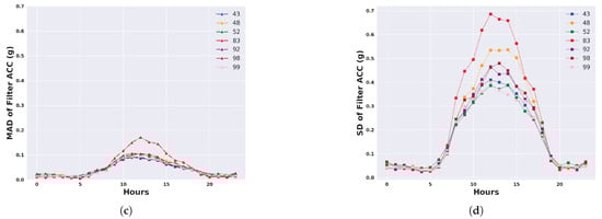 - Riaboff, L.; Aubin, S.; Bédère, N.; Couvreur, S.; Madouasse, A.; Goumand, E.; Chauvin, A.; Plantier, G. Evaluation of pre-processing methods for the prediction of cattle behaviour from accelerometer data. Comput. Electron. Agric. 2019, 165, 104961. [Google Scholar] [CrossRef]