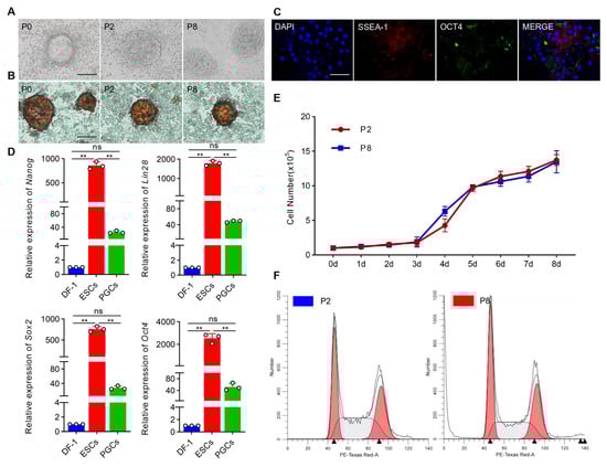 High-quality cESCs were obtained for the induction of cPGCs in vitro. (A) Morphological observation of ESCs from different generations. Scale bar: 60 µm. (B) ESCs clones (brownish-red) were stained with AKP staining. Scale bar: 60 µm. (C) The cultured ESCs were identified through indirect immunofluorescence detection with SSEA-1 and OCT4 antibody. Scale bar: 60 µm. (D) qRT-PCR was used to detect the expression of pluripotency marker genes (Nanog, Lin28, Sox2, Oct4) in ESCs and PGCs (data are shown as mean ± SEM, n = 3 independent experiments, ** p < 0.01, one-way ANOVA). DF-1 cells were used as control. (E) Proliferation curves of ESCs (P2 and P8) (data are shown as mean ± SEM, n = 3 independent experiments, ** p < 0.01, t test). (F) Cell cycle analysis of ESCs (P2 and P8).