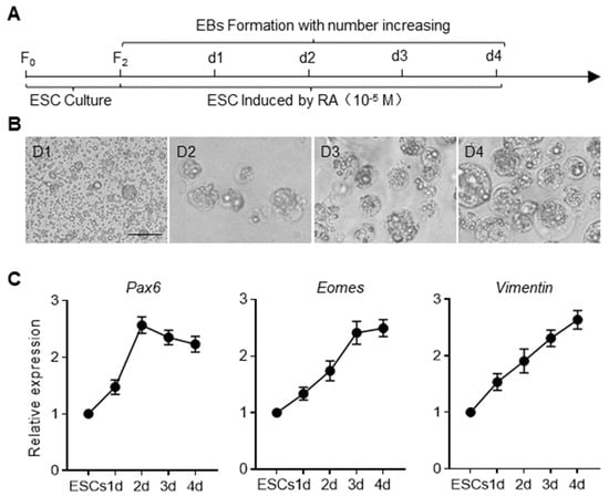 In order to establish a two-step PGC induction model, this study intended to use retinoic acid (RA) (10−5 M) [7] to induce ESCs into embryoid bodies (EBs, Figure 2A). The results of morphological statistics showed that cells began to differentiate and formed a dense internal structure at day 2–day 3 after RA induction, at which time EBs had formed. The number of EBs continued to increase (Figure 2B and Figure S2A). To further evaluate the EB formation process, we examined the relative expression of the marker genes of three germ layers, Vimentin (for endoderm), Eomes (for mesoderm) and Pax6 (for ectoderm), during induction. The results of the qRT-PCR showed that Vimentin and Eomes were consistently upregulated throughout the induction of EBs, while the expression of Pax6 started to decrease at day 2 but showed an overall increasing trend, possibly because, during the EB formation, the ectoderm formed first and subsequently differentiated to form the mesoderm and endoderm (Figure 2C). Further gene expression analysis showed that the expressions of Vimentin, Eomes and Pax6 were higher in EBs than in ESCs and PGCs (Figure S2B). These results indicate that ESCs were induced to differentiate into EBs with three germ layers after 4 days of culturing with RA.