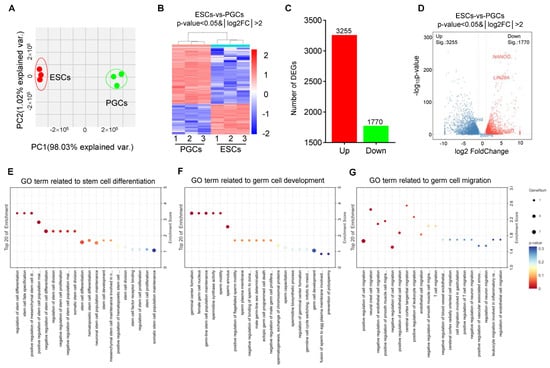 Differences between ESCs and PGCs were analyzed using RNA−seq. (A) PCA was used to analyze the differences between 3 samples of ESCs and PGCs. (B,C) Statistics of differentially expressed genes during PGCs’ formation. (D) Volcanic map of differential genes between ESCs and PGCs. (E–G) GO analyzed the enrichment of differentially expressed genes in related items of “stem cell differentiation”, “germ cell development” and “germ cell migration”.
