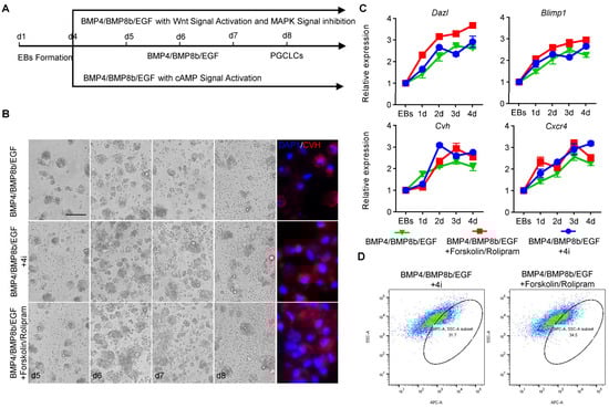 Two-step induction model: The ESCs that were in good condition were inoculated into the 6-well plates with EB induction medium containing KO-DMEM, 10% KSR, 2.0 mM GlutaMax, 1% non-essential amino acids, 1% chicken serum, 0.1 mM β-mercaptoethanol, 1% penicillin–streptomycin and 10-5 M RA (Sigma-Aldrich, R2625). Half medium was replaced every 2 days. After culturing for 4 days, the same medium was used, in which 10-5 M RA was replaced by 40 ng/mL BMP4, 40 ng/mL BMP8b and 40 ng/mL EGF for PGCLC induction; 4i: CHIR99021 (MCE, HY-10182), PD0325901 (MCE, HY-10254), BIRB796 (MCE, HY-10320), SP600125 (MCE, HY-12041) or Forskolin (MCE, HY-15371), Rolipram (MCE, HY-16900) were added to optimize the PGCLC induction system.