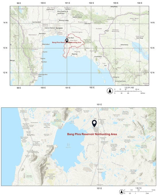 The location of sample collection (Bang Phra Reservoir Nonhunting Area (13.1585° N, 101.0176° E), Chonburi province (13.2017° N, 101.2524° E), Thailand).