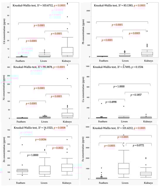 Boxplot comparison of heavy metal concentrations in feathers, livers, and kidneys of all birds. The p < 0.05 was considered statistically significant.