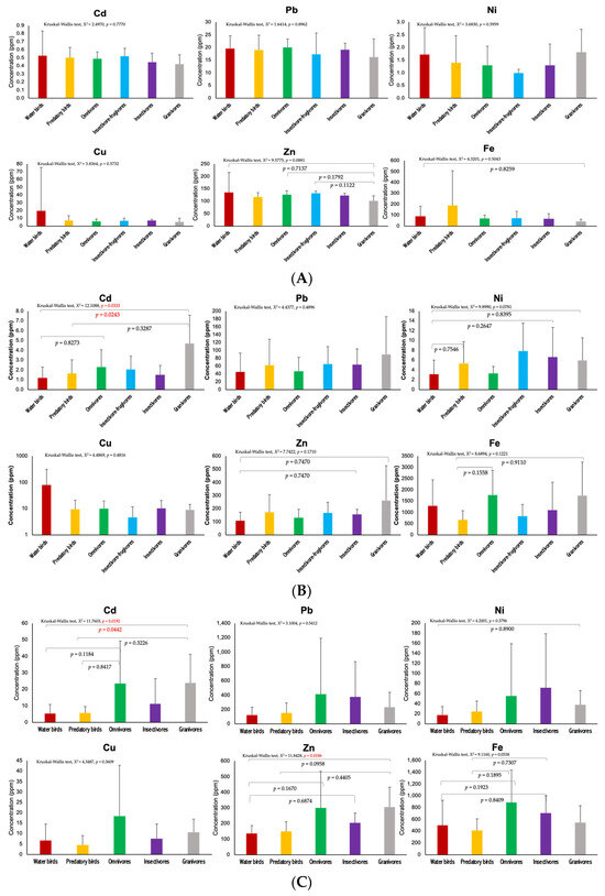 Comparison of heavy metal concentrations (mean ± SD) in feathers (A), livers (B), and kidneys (C) among six groups of birds. The p < 0.05 was considered statistically significant.