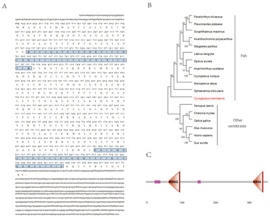 Sequence verification and phylogenetic tree analysis of C. semilaevis rnf34. (A) mRNA sequence and amino acid sequence of rnf34. The blue region is a ring domain. (B) A total of 17 species rnf34 sequences constitute a phylogenetic tree. C. semilaevis is highlighted in red to show its evolutionary position. (C) Predicted protein structures of rnf34. Horizontal gray bars represent amino acid sequences with no predictive functional domains, while colored boxes represent regions with reliable predictive functional domains. Two zinc finger RING type domain (red triangle); two low complex regions (pink rectangle).