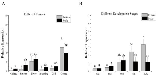 C. semilaevis was received from Haiyang Aquaculture Experimental Base (Haiyang, China). Tail fins were clipped from each fish for genetic sex determination. The extracted DNA was used as a template for gender testing according to the DNA reagent extract instructions (TIANGEN Biotech, Beijing, China). PCR was performed with the primers Sex-F and Sex-R (Table 1), and the product was gel electrophoresis with 4% agarose concentration at 150 V voltage for 25 min. At the end of electrophoresis, there were two bands (134 bp and 169 bp) amplified in females and one band (169 bp) in males []. In this study, spleen, intestine, gills, kidney, liver, and gonad samples were collected from males and females 1.5 years of age, fast frozen in liquid nitrogen, and stored at −80 °C. Gonads from C. semilaevis at different developmental stages, including 40 days, 60 days, 90 days, 6 months, and 1.5 years post hatching (40 dph, 60 dph, 90 dph, 6 mph and 1.5 yph), were also picked up. Each stage contains three males and three females. The gonad samples were stored in −80 °C refrigerators for RNA extraction. At the same time, parts were preserved in 4% (w/v) paraformaldehyde fixing solution and paraffin sectioned for in situ hybridization (ISH).