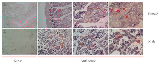 Primer pairs rnf34 probe F and probe R with T7 polymerase and SP6 endonuclease sites were designed (Table 1) to amplify a 448 bp fragment. The PCR products were recovered. In vitro transcription by T7 or SP6 RNA polymerases was performed to generate digoxin (DIG)-labeled antisense or sense RNA probes according to the kit (Roche in vitro transcription) and the digoxin probe instructions. After that, the probe was purified. The gonad samples of 1.5 yph male and female fish were sliced and fixed after dewaxing and hydration. Sections were pre-hybridized for 4 h at 60 °C. In identical liquid, an overnight incubation at 60 °C with probes (final concentration 0.2 g/mL) was performed on gonadal slices. Incubation with anti-DIG antibodies (Roche) was performed overnight after slices were blocked for 4 h at room temperature. In the end, nitroblue tetrazolium/5-bromo-4-chloro-3-indolyl phosphate (Roche, Mannheim, Germany) was used to generate the signal. Photos were taken with a Nikon EClIPSE 80i microscope equipped with 40×, 100×, and 200× lenses.