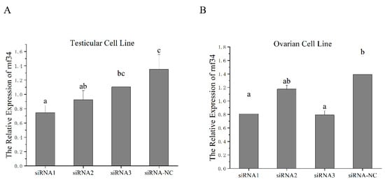 Design siRNAs to knockdown the gonadal tissue cells of C. semilaevis. (A) The relative expression levels of rnf34 in the testicular cell line. (B) The relative expression levels of rnf34 in the ovarian cell line. In multiple comparisons, different alphabets indicated significant difference. Groups with two letters represent no significant difference from groups with one of the letters.