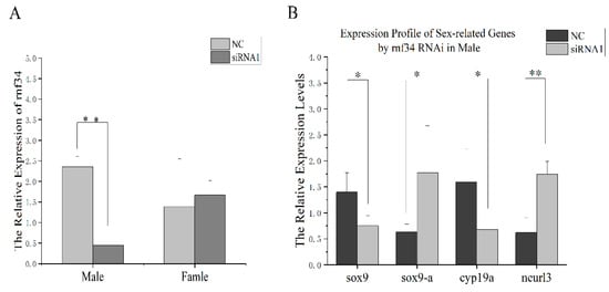 In vivo siRNA knockdown and sex-related gene expression levels. NC: the siRNA for Nematoda. (A) In vivo siRNA knockdown in males and females. (B) The effect of the knockdown of rnf34 on other sex-related genes. One asterisk indicates a significant difference of less than 0.05, and two asterisks indicate a significant difference of less than 0.01.