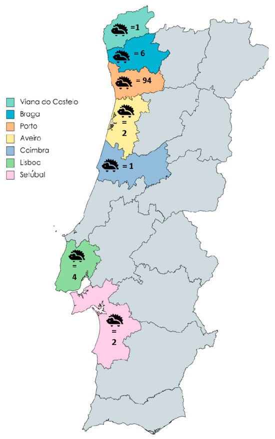 All hedgehog stool samples from the CRFPBG were from European hedgehogs (Erinaceus europaeus) and were obtained between September 2021 and April 2023. Stool samples from CRIDO included European hedgehogs, except for four individuals, namely three four-toed hedgehogs (Atelerix albiventris) and one long-eared hedgehog (Hemiechinus auritus). CRIDO samples were collected between December 2022 and May 2023. Most samples (n = 94) were derived from hedgehogs found in the Porto district, with smaller numbers from Braga (n = 6), Lisboa (n = 4), Setúbal (n = 2), Aveiro (n = 2), Coimbra (n = 1), and Viana do Castelo (n = 1) (Figure 1).