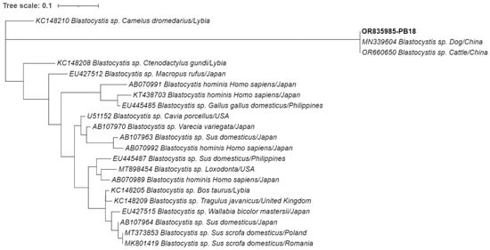 Phylogenetic analysis of the small-subunit ribosomal RNA (SSU-rRNA) gene was conducted for Blastocystis sp. found in European hedgehogs. Inference was performed using the maximum likelihood method and the Tamura 3-parameter model. The analyses were performed with the assistance of MEGA X software, followed by tree editing using Interactive Tree of Life (iTOL). The isolates obtained in this study are highlighted in bold with their respective accession numbers, while the 21 additional Blastocystis species strains obtained from GenBank are shown without bold formatting, followed by their respective accession numbers, species, hosts, and country of origin.
