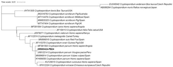 To isolate and purify amplicons, GRS PCR and Gel Band Purification Kit (GRiSP®) technology was employed. This method effectively separates positive amplicons that match the expected size from the surrounding non-target DNA fragments. Subsequently, the Sanger sequencing method was used, employing specific internal primers designed for the target gene. The bidirectional sequencing process generated two complementary sequences, which were then aligned and compared with existing entries in the NCBI (GenBank) nucleotide database. This comparative analysis was performed using the BioEdit Sequence Alignment Editor v7.1.9 software package (version 2.1), relying on the database accessed on 20 November 2023. For a more in-depth analysis and interpretation of the obtained sequences, the MEGA version X software was utilized []. Applying the Hasegawa–Kishino–Yano model, maximum likelihood (ML) bootstrap values with 1000 replicates were estimated for statistical robustness. The selection of this model, recognized as the most effective replacement, was determined through MEGA version X []. The sequences from this study have been deposited in the GenBank® database, with each assigned a unique accession number: OR835985 (Blastocystis sp.) and OR880424 (Cryptosporidium parvum).