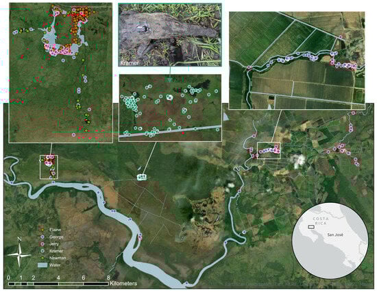Tempisque River basin in Costa Rica with Palo Verde National Park depicted between the two rivers. Each crocodile is represented by a unique point color. The top-left, top-right, and middle windows show zoomed-in portions of the basin for visual aid. The top-middle window displays a crocodile (Kramer) with an attached satellite tag. The top-left insert also depicts the release location for all translocated crocodiles.