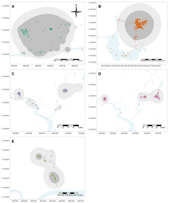 Home range predicted from the Brownian bridge movement models for each individual: Kramer (resident; (A)), Elaine (resident; (B)), George (translocated; (C)), Jerry (translocated; (D)), Newman (translocated; (E)). Points represent the successfully received GPS data. Shaded areas are the 50% (dark gray), 75% ((A,B); light gray), and 95% ((C–E); light gray) estimated habitat utilization distributions.