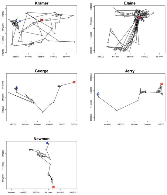 Initial (blue triangle) and final (red square) locations of each individual based on the type II random walk trajectory used for the Brownian bridge movement models that were used to estimate home range (Figure 2).