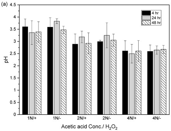 Relation between (a) pH value and (b) electrical conductivity (EC) in acid-extracted supernatant with or without 2% hydrogen peroxide solution at different acetic acid concentrations (1N, 2N, and 4N) and contact times (4, 24, and 48 h). The error bar is the standard error of the mean (n = 3).