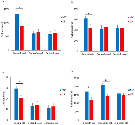 The numbers of CD4+ (Figure 1A), CD8+ (Figure 1B), and CD4+CD8+ (Figure 1C) cells in the MC group were significantly higher (p < 0.05) compared with the CR group at 1 month of age; however, there were no significant differences between the groups at 2 and 3 months of age. Additionally, the number of γδ T cells in the MC group was significantly higher (p < 0.05) than that in the CR group at 1 and 2 months of age (Figure 1D). Furthermore, the numbers of B cells (Figure 2A) and MHC class II+ cells (Figure 2B) in the MC group were significantly higher (p < 0.01 and p < 0.05, respectively) compared with the CR group at 3 months of age, but there were no significant differences at 1 and 2 months of age. The number of WBCs was slightly higher in the MC group for all 3 months compared to the CR group; however, the difference between groups was not significant (Figure S1).