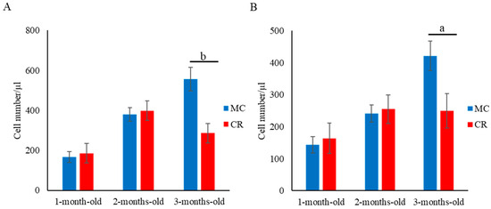 Effect of MC and CR feeding on B cell populations in JB calves. Populations of B cells (A) and MHC class II+ cells (B) were recorded in 1-, 2-, and 3-month-old calves. Data are presented as the mean ± SD. Letters (a: p < 0.05 and b: p < 0.01 MC vs. CR) indicate significant differences.