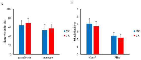 The phagocytic index of granulocytes and MHC class II+ monocytes did not differ significantly between the MC and CR groups (Figure 3A). Similarly, there was no significant change in the lymphocyte proliferative response to Con A and PHA between groups, but the responses to Con A and PHA were slightly higher in the MC group than the CR group (Figure 3B).