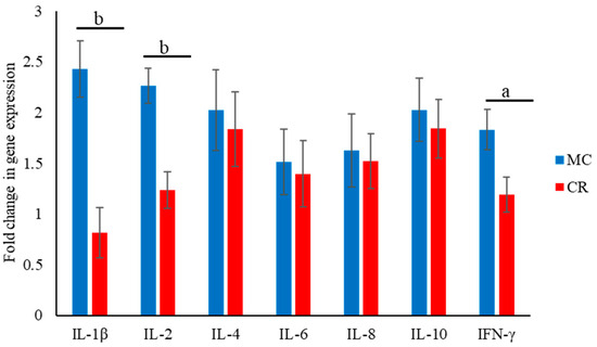 Effect of MC and CR feeding on the expression of mRNAs encoding IL-1β, IL-2, IL-4, IL-6, IL-10, and IFN-γ. The fold-change in the gene expression was measured in 1-month-old JB calves. Expression levels were measured using real-time PCR. Data are presented as the mean ± SD. Letters (a: p < 0.05 and b: p < 0.01 MC vs. CR) indicate significant differences.