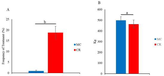 Effect of MC and CR feeding on treatment for respiratory diseases and carcass weight in JB calves. The frequency of treatments was recorded in 1-month-old JB calves by the Japanese Mutual Aid Association (NOSAI) veterinary staff (A), and carcass weight was recorded at the age of 30 months after slaughtering (B). Data are presented as the mean ± SD. Letters (a: p < 0.05 and b: p < 0.01 MC vs. CR) indicate significant differences.