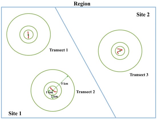 A schematic diagram for evaluating the influence of scale dependence on community structure. In our study, two scale-changing properties were evaluated: varying the study area extent (transect-site-region) and varying the sampling range (1 km, 2 km, and 5 km). Line transects are marked as red polylines.