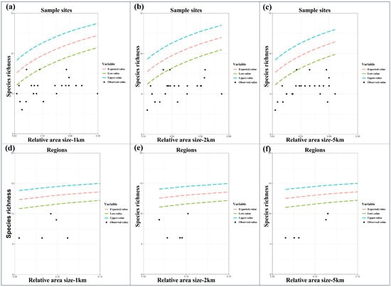 The relationships between species richness and relative area size predicted by the random placement model at sample-site (see subfigures (a–c)) and regional spatial scales (see subfigures (d–f)). Expected values and the 95% confidence interval (dashed lines), observed species richness of amphibians (black dots). Note that here, suitable habitat area sizes were determined by using 1 km, 2 km, and 5 km buffering circles.