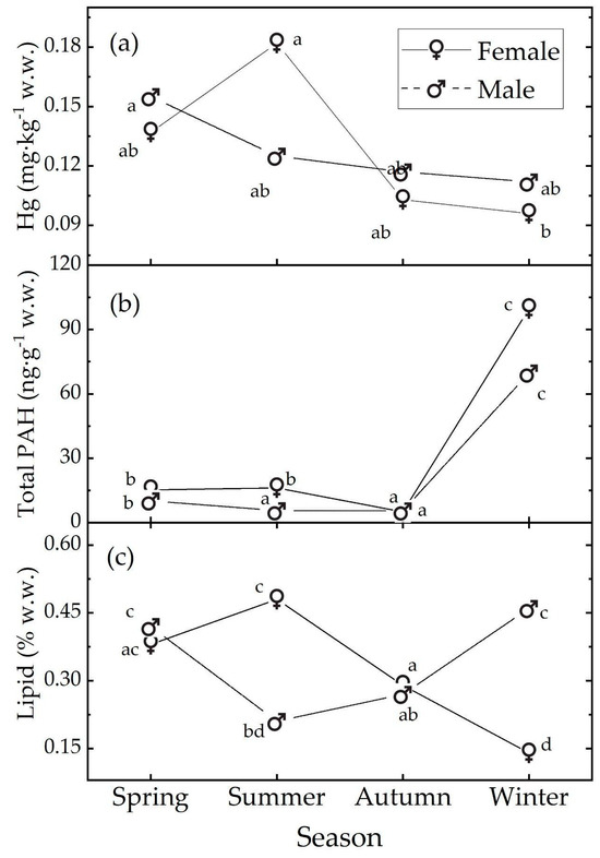 Median levels of (a) Hg, (b) total PAH, and (c) % lipids observed in the muscle tissue of M. merluccius as a function of sex and season. The medians with different letters differ at the p value = 0.05. The letters refer to the post hoc ART results; see text and Supplementary Materials.