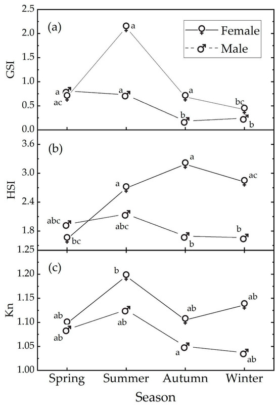 Median values of (a) GSI, (b) HSI, and (c) Kn Le Cren indexes as a function of sex and season. Medians with different letters differ at the p value = 0.05. The letters refer to the post hoc ART results; see text and Supplementary Materials.