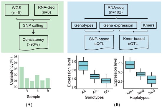 Schematic diagram of the study design. (A) SNP consistency checkup using WGS and RNA-seq data (left panel, green); (B) assessment of the two methods of eQTL analysis (right panel, blue).