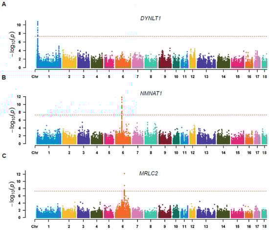Manhattan plots of the association results of the representative genes. Manhattan plots of (A) DYNLT1, (B) NMNAT1, and (C) MRLC2. The red dashed line in the Manhattan plots represents the level of significance.