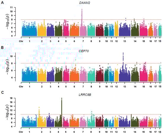 Manhattan plots of the kmer-based association results of the representative genes. Manhattan plots of (A) DAAM2, (B) CEP70, and (C) LRRC8B. The red dashed line in the Manhattan plots represents the level of significance.