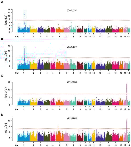 Manhattan plots of both association results of the representative genes. Manhattan plots of (A) ZWILCH, (B) ZWILCH, (C) PCMTD2, and (D) PCMTD2. The top panel shows the association results based on SNPs and the bottom panel shows the association results based on kmers. The red dashed line in the Manhattan plots represents the level of significance.