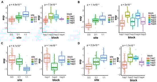 To further validate the significant association signals discovered between gene expression levels and candidate functional sites, we calculated the correlation between the top SNP sites and gene expression levels among these significant signals in all samples. In addition, in order to avoid the loss of genetic information and the weakening of statistical power captured by a single SNP locus, we extracted haplotype blocks consisting of the top SNP sites and the 10 SNP sites upstream and downstream from each, and then analyzed the correlation with the corresponding associated gene expression levels. In total, 30 hits based on SNPs alone were found, accounting for 52.63%, whereas this percentage was as high as 76.67% in the hits found by both methods (Supplementary Figure S4A). This result implies that SNPs and kmers containing multiple variant types at the transcriptome level have complementary roles in mining eQTLs. The boxplots showed the correlations between the genotype corresponding to the top SNP locus, and the genetic sequence corresponding to the haplotype block composed of its flanks and the expression levels of the associated genes (Figure 6). This result suggests that haplotype block analysis by integrating multiple SNP information may help us to better understand the genetic structure and its diversity that affects the expression levels of genes associated with economically important traits, and to improve the ability to detect true associations.