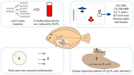 CYP21A2, a cytochrome P450 enzyme situated within the endoplasmic reticulum, plays a pivotal role in humans by facilitating the conversion of 17-hydroxyprogesterone (17OHP) into 11-deoxycortisol, as well as the conversion of progesterone into 11-deoxycorticosterone [34]. CYP21A2 deficiency in humans leads to congenital adrenal hyperplasia, manifested by corticosteroid deficiency, secondary hyper-androgens, and even pseudohermaphroditism in women [35,36]. In our results, the intersex P. olivaceus had 28 SNPs in the cyp21a gene and the activity of 21-hydroxylase was reduced by about 20%, which is similar to the clinical symptoms of congenital adrenal hyperplasia. Thus, it is speculated that the synchronously sexual maturation of intersex P. olivaceus may be related to the endocrine imbalance caused by the decreased activity of 21-hydroxylase. Therefore, the mechanism of the synchronously sexual maturation of intersex P. olivaceus can be further investigated through the knockout of the cyp21a gene of P. olivaceus.