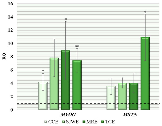 Relative quantification (RQ) of expression level of genes related to the growth and development of skeletal muscle tissues in breast muscles of broiler chickens (Gallus gallus L.) of the “Smena 9” cross when using phytobiotics in the diet: (RQ—fold change in expression level compared to the first group, where the parameter was taken as 1; *, **—the difference in ΔCt values is statistically significant compared to the control group at p ≤ 0.05, p ≤ 0.01 according to the t-criterion; the horizontal dashed line indicates the level of gene expression in the control group; results are presented as the mean with the standard error of the mean (M ± SEM) for mRNA expression).