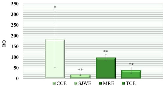 - Livak, K.J.; Schmittgen, T.D. Analysis of relative gene expression data using real-time quantitative PCR and the 2−ΔΔCT method. Methods 2001, 25, 402–408. [Google Scholar] [CrossRef]