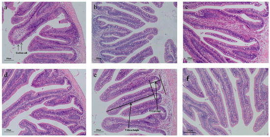 For histomorphometric assessment, the intestinal samples underwent sequential dehydration in increasingly concentrated ethyl alcohol solutions, followed by xylene treatment for clearing and subsequent embedding in paraffin wax. Subsequently, the embedded samples were sectioned into 6 μm slices, mounted on glass slides, and stained with hematoxylin and eosin. Three slides were prepared for each intestinal segment for morphological examination, and analysis was performed using a light microscope. This procedure was conducted at the animal physiology laboratory of Zhejiang University in Hangzhou, China. Image acquisition was carried out using an OLYMPUS (CX21) microscope. Villus height measurement was performed using Image-Pro Plus (IPP6.0) software, assessing twelve well-oriented villi per image, with the exact height measured from the villus tip to the crypt junction.