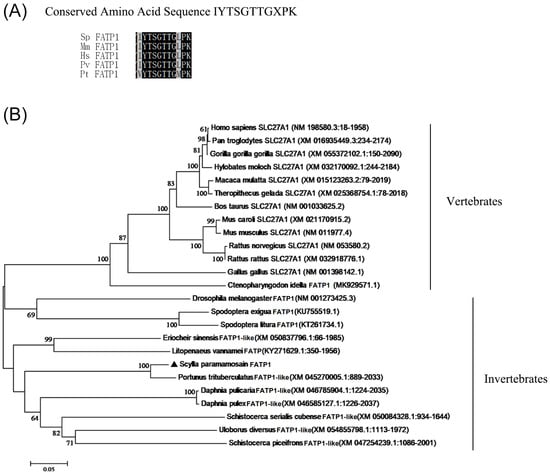 The full-length cDNA sequence of the FATP1 gene comprised a 1929 base pair open reading frame (ORF), which encodes a polypeptide with 643 amino acids. The nucleotide sequence is accessible in the GenBank database under accession number OR232206. The predicted FATP1 polypeptide has a molecular weight of 71.777 kDa and a theoretical isoelectric point of 8.06. The deduced FATP1 polypeptide exhibits all characteristic features of the FATP family, including a conserved amino acid sequence (IYTSGTTGXPK, as shown in Figure 1A), an acyl-CoA-synthase-related domain (illustrated in Figure S1 [37]) and three predicted transmembrane regions located at amino acid residues 15–43, 134–160 and 392–419 within the N-terminus. Homologous sequence alignment indicated that the FATP1 of S. paramamosain shares a low sequence identity of about 45% with vertebrates and a relatively high identity of about 64% with invertebrates, particularly with Penaeus vannamei (about 65%) (Figure S2). Phylogenetic analysis reveals that it clusters with other FATP1 orthologs from decapod crustaceans, notably Portunus trituberculatus, and is distinctly separated from the FATP1 orthologs of vertebrates (Figure 1B).