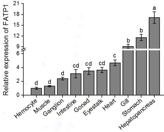 Relative tissue distribution profile of FATP1 in mud crab determined by qPCR. Values are means ± SEM (n = 6) as fold change from the hemocyte and bars with different superscript letters indicate significant differences among the detected tissues (p < 0.05; ANOVA, Tukey’s test).