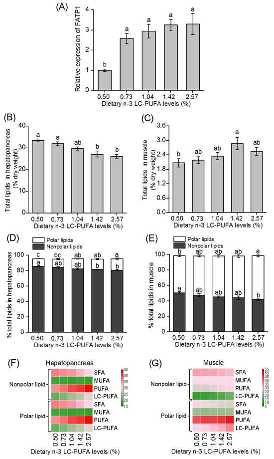 The mud crab FATP1 may be involved in long-chain polyunsaturated fatty acid (LC-PUFA) metabolism and deposition. (A) The relative mRNA expression levels of FATP1 in hepatopancreas of mud crabs fed different dietary levels of n-3 LC-PUFA. Total lipid contents (% dry weight) of (B) hepatopancreas and (C) muscle of mud crabs fed different dietary levels of n-3 LC-PUFA. Polar and nonpolar lipid contents (% total lipid) of (D) hepatopancreas and (E) muscle of mud crabs fed different dietary levels of n-3 LC-PUFA. The heatmap visualization of the abundance of total saturated fatty acid (SFA), monounsaturated fatty acid (MUFA), polyunsaturated fatty acid (PUFA) and LC-PUFA in polar and nonpolar lipids of (F) hepatopancreas and (G) muscle of mud crabs fed different dietary levels of n-3 LC-PUFA. Before analysis, all data were checked for homogeneity. Data are presented as means ± SEM (n = 3). Bars with different superscript letters in panels (A–E) indicate significant differences.