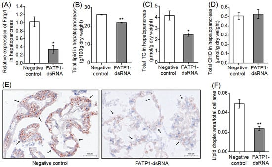 After 2 weeks of continuous dsRNA injection, the expression level of FATP1 in the hepatopancreas decreased significantly compared with the control group (Figure 4A). In the hepatopancreas of crabs after knockdown of FATP1, the concentration of TG and the contents of total lipid were reduced significantly (p < 0.05) (Figure 4B,C), while no difference was found in the content of total cholesterol (Figure 4D) compared with the control group. Significantly fewer lipid droplets were observed in crabs treated with FATP1 dsRNA than in crabs of the control group (p < 0.01) as evident in hepatopancreas stained with ORO (Figure 4E,F).