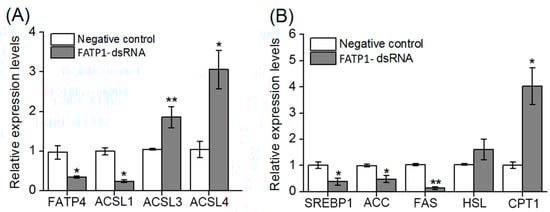 Compared to the negative control, the expression levels of FATP4, ACSl1, SREBP1, ACC and FAS were decreased significantly (p < 0.05), while the expression levels of ACSl3, ACSL4 and CPT1 genes were increased significantly in crabs after knockdown of FATP1 by RNA interference (p < 0.05) (Figure 5). However, there were no statistical changes observed in the transcript level of HSL in the hepatopancreas of crabs subjected to FATP1 dsRNA (Figure 5B).