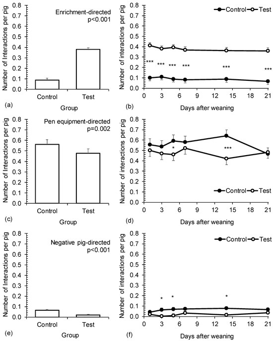The effect of treatment and time on the enrichment-directed behaviours (a,b), pen equipment-directed behaviours (c,d) and negative social behaviours in piglets (e,f). Control—one set of enrichment objects (one piece of wood and one toy) provided for the whole weaning group of piglets. Test—quantity of enrichment objects adjusted to the number of litters mixed (one piece of wood and one toy provided per each litter). The effect of time was not significant in any model (p ≥ 0.05). The effect of interaction treatment group × time was not significant in any model (p ≥ 0.05). *, *** denote statistically significant differences between groups within day (p < 0.05 and p < 0.001, respectively).