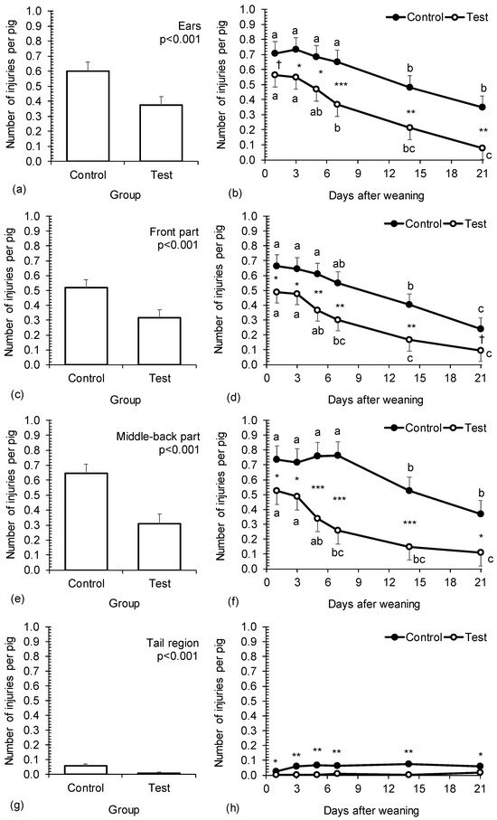 The effect of treatment and time on the incidence of injuries on ears (a,b), front part (c,d), middle-back part (e,f) and tail region (g,h) in piglets. Control—one set of enrichment objects (one piece of wood and one toy) provided for the whole weaning group of piglets. Test—quantity of enrichment objects adjusted to the number of litters mixed (one piece of wood and one toy provided per each litter). The effect of time was highly significant (p < 0.001) in all models. The effect of interaction treatment group × time was not significant in any model (p ≥ 0.05). *, **, *** denote significant differences between groups within day (p < 0.05, p < 0.01 and p < 0.001, respectively); † denotes the tendency of significant differences between groups within day (0.05 ≤ p < 0.10); abc denote statistically significant differences between days within treatment group.