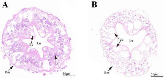 HE staining of hepatopancreatic tissue structure of E. j. sinensis under ammonia stress. (A), control group; (B), medium-concentration stress group (300 mg/L); Bm, basement membrane; Bc, secretory cell; Ec, embryonic cell; Va, vacuole; Lu, lumen.